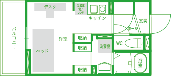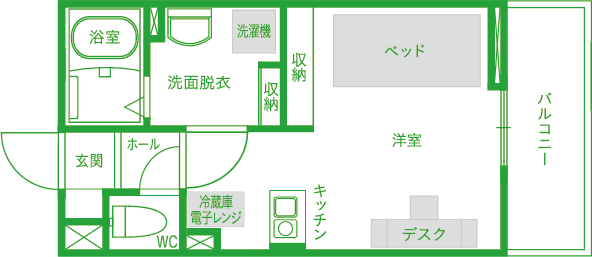 バス/トイレ別、エアコン、洗面化粧台、キッチン、クローゼット、サンルーム(一部)、バルコニー、モニター付インターホン、インターネット無料、温水洗浄便座、照明器具、IH、シューズBOX、冷蔵庫、洗濯機、デスク、椅子、ベッド、電子レンジ