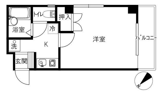 お部屋は1Kタイプの間取りとなっており、ひとり暮らしにちょうどいい広さとなっています。