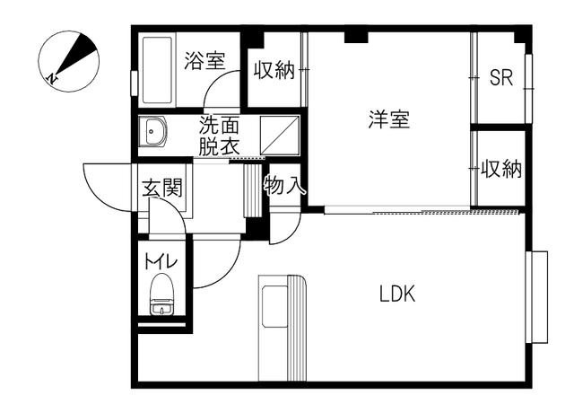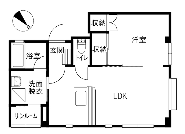 対面キッチン付きリビングと5帖前後の洋室からなる1LDKタイプの造り。生活空間を分けられるのがこの間取りのイイところ☆広々とした空間で過ごしたい方には、洋室の仕切り戸を開けて一つの部屋として利用するのもおススメです♪