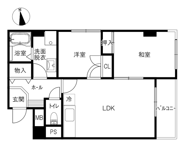 お部屋は2LDKの間取りになっており、居室と水回りがそれぞれまとまっています。
