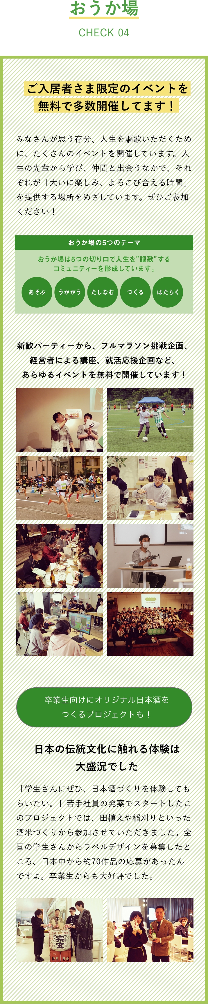 新歓パーティーから、フルマラソン挑戦企画、経営者による講座、