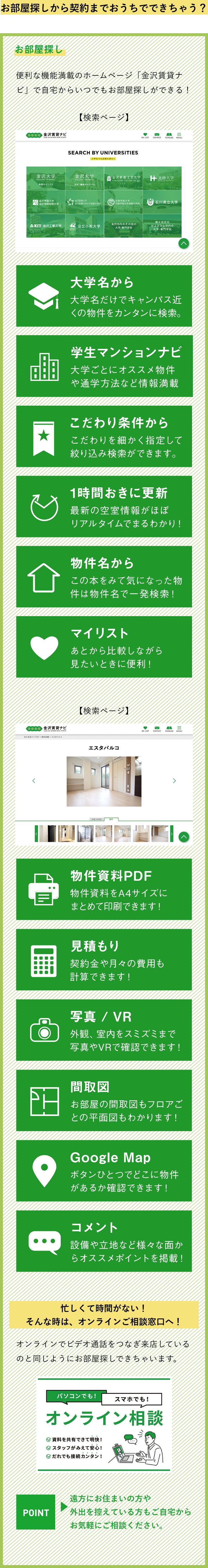 便利な機能満載のホームページ「金沢賃貸ナビ」で自宅からいつでもお部屋探しができる。